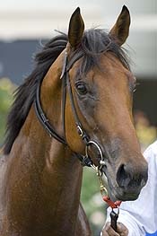 Weekend Hussler (red and black, white cap) winning the G1 Newmarket Handicap, at Flemington on Saturday 8 March 2008, ridden by Brad Rawiller, trained by Ross McDonald.  Photo by Bronwen Healy